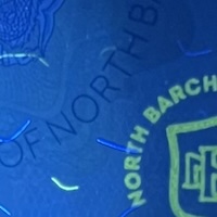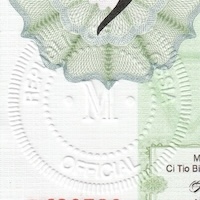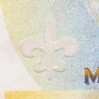 Hologram: Hologram usually refers to a small piece of metallic foil or strip bearing a certain pattern or image that glitters or even alters when viewed from a different angle. The holographic foil is often incorporated to the substrate via a method known as hot stamping (see "Foil stamping" in Section IV), but this can be quite costly and require some professional works, thus only afforable for some micronations, such as Aigues-Mortes and Alcatraz. Instead, most micronations simply adopt ready-to-use holographic stickers as a more viable substitute for their banknotes, such as Boshka and Valbona.